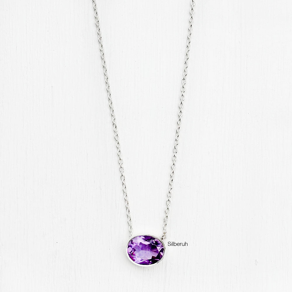 This necklace features a natural Amethyst gemstone. Each stone may vary slightly in colour and clarity, making every piece unique.