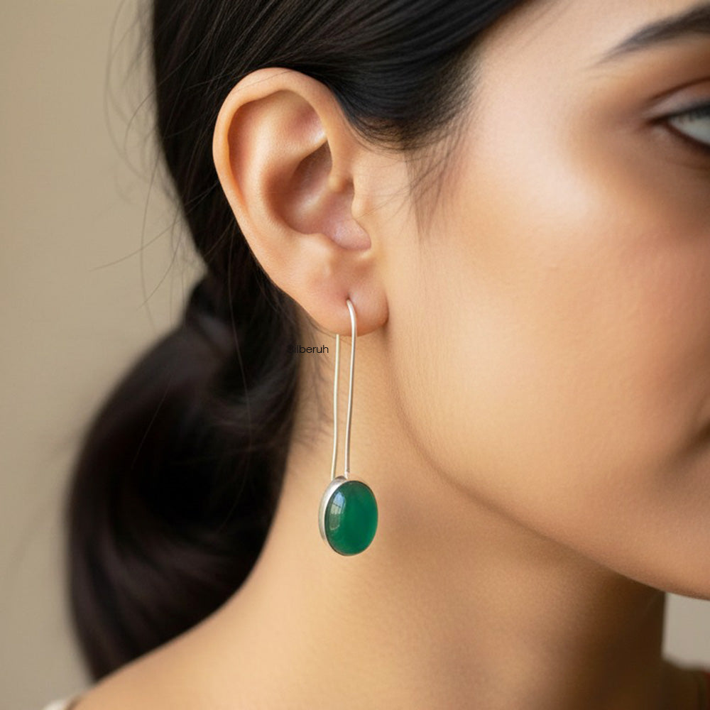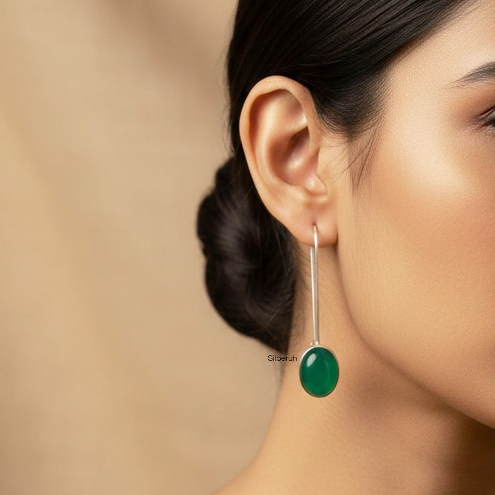 925 Silver Green Onyx Long Hook Silver Earring