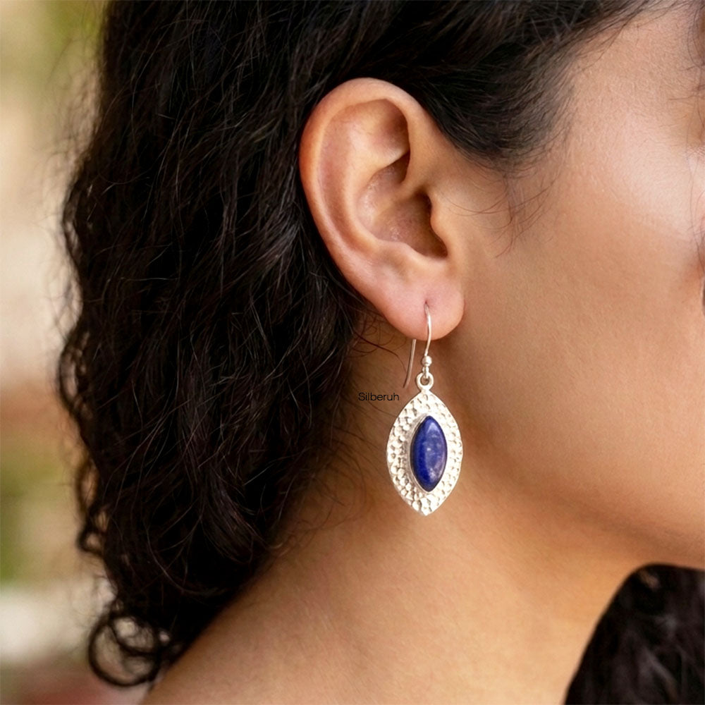 925 Silver Lapis Lazuli Hammered Earrings | Natural Gemstone Drop Earrings
