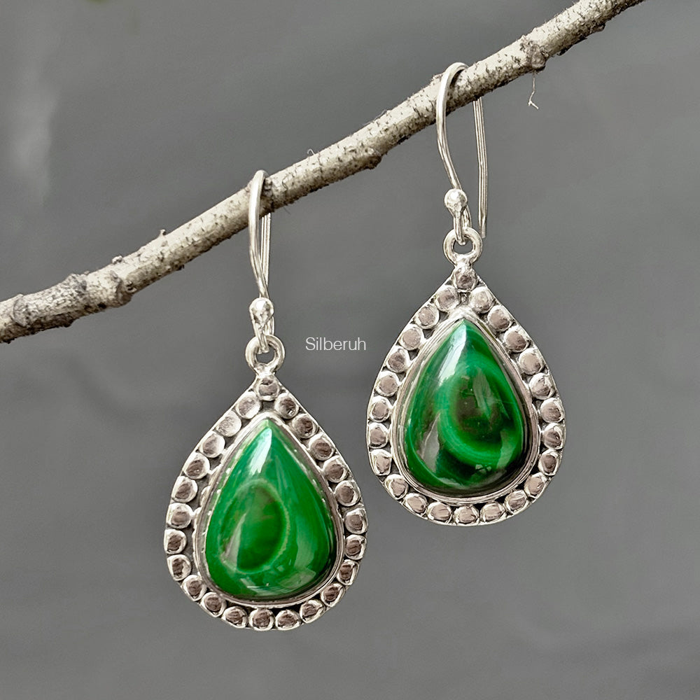 925 Silver Malachite Drop Earrings – Natural Stone for Protection & Prosperity