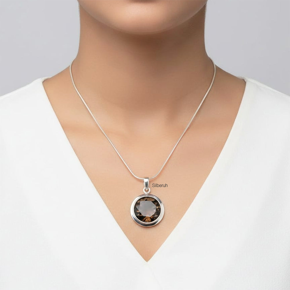 925 Silver Facetted Smoky Quartz Round Pendant | Natural Grounding Crystal Jewellery